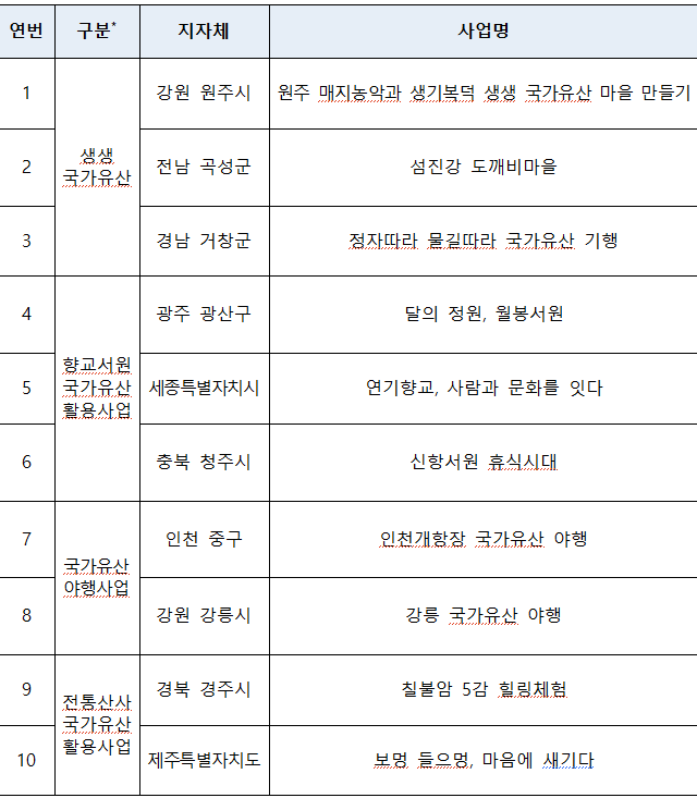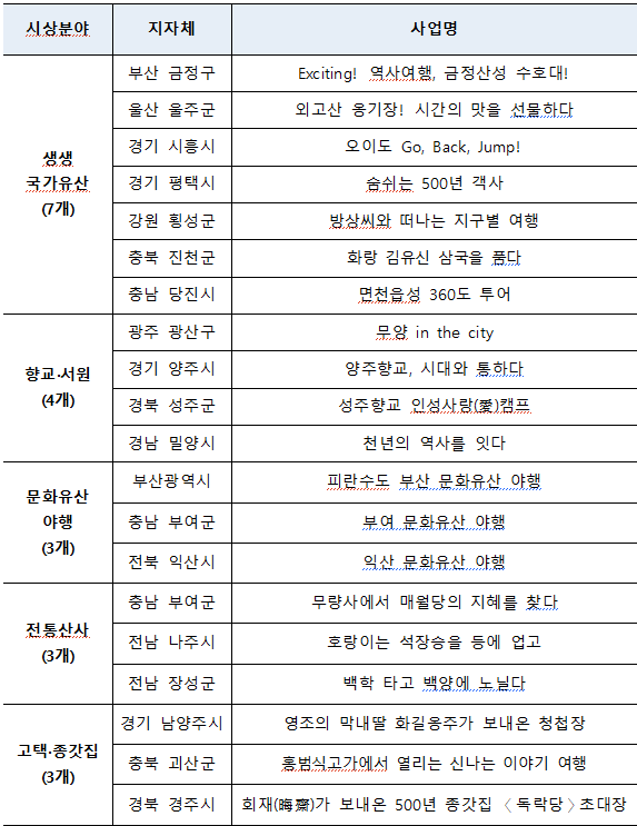 먼저, ‘생생 국가유산’ 부문에서는 ▲ 옹기를 활용한 콘텐츠를 일관성 있게 기획해 낸 「외고산 옹기장! 시간의 맛을 선물하다(울산 울주군)」, ▲ 지역의 문화자원과 그에 얽힌 이야기를 효과적으로 활용한 「숨쉬는 500년 객사(경기 평택시)」, ▲ 전통 장례문화를 소재로 차별화된 문화콘텐츠를 기획한 「방상씨와 떠나는 지구별 여행(강원 횡성군)」 등 7개 사업이 선정되었다.